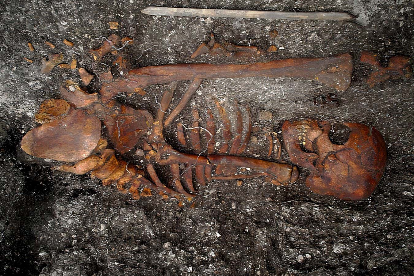 A human skeleton at a prehistoric burial site in southern Brazil, where DNA of bacteria similar to the syphilis bacterium has been found